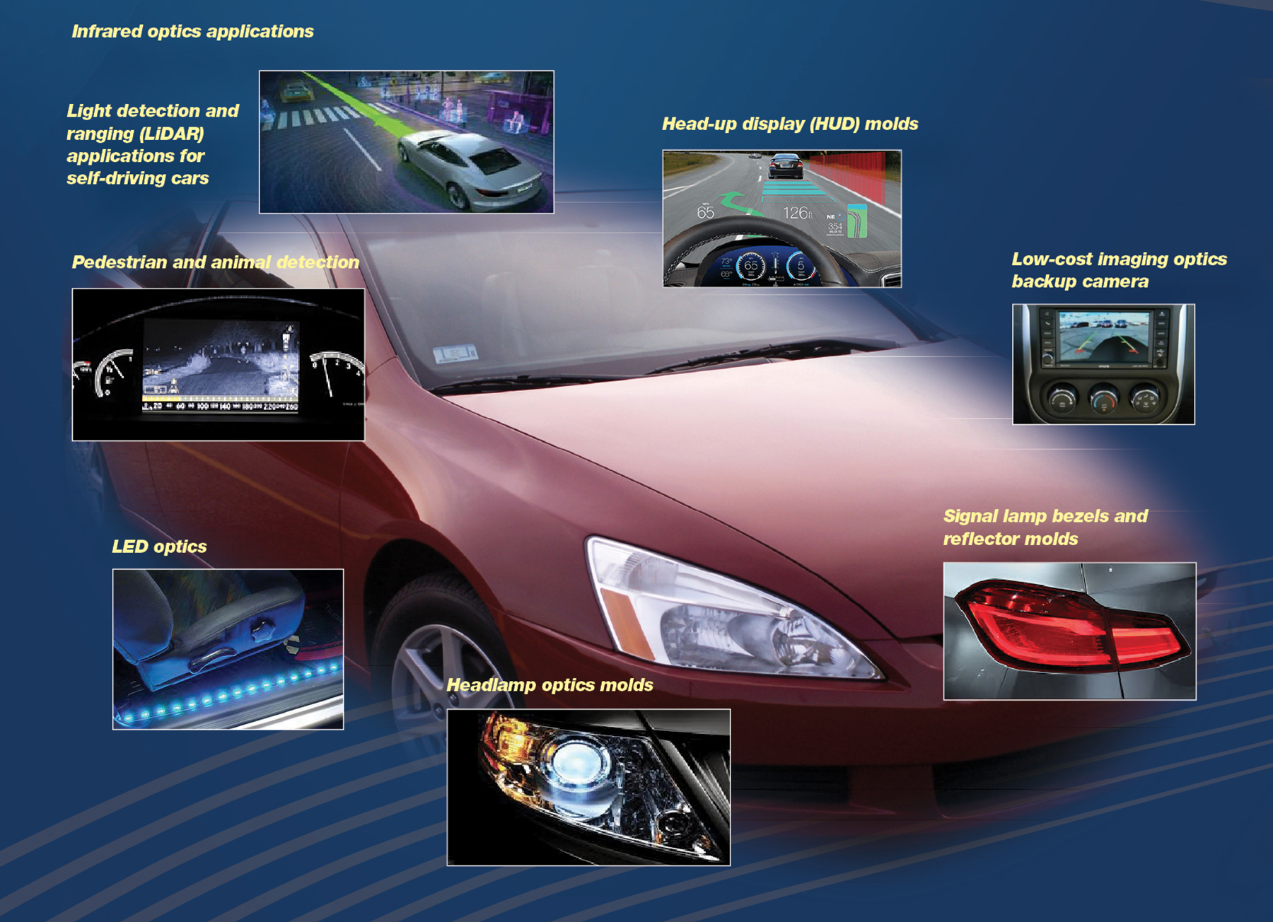 Levicron®和Freeform® L 5轴机床的HSK25快速换刀系统可用于制造汽车信号灯边框和反射器的角隅棱镜模具。此外,Precitech在红外制造技术方面的悠久历史和丰富知识使得自引导汽车的LiDAR系统和行人/动物检测等汽车IR应用成为可能。